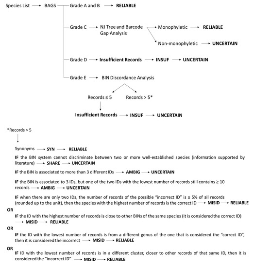 To compile and audit the available COI barcode data for each species in the list, we used the software BAGS ([44]; https://github.com/tadeu95/BAGS (accessed on 20th September 2021)). This tool annotates species records in five grades (A–E) according to the congruency between species assignments and BINs, and the quantity of the sequences present in the BOLD database [27]: A and B for concordant morphospecies, (one BIN = only one species name), where these grades only differ in the quantity of available sequences in the library (grade A: > 10 sequences and grade B: ≤ 10 sequences), C for morphospecies assigned to multiple BINs, D for morphospecies with insufficient sequences (<3) and E for seemingly discordant morphospecies (more than one species name in the same BIN). With the graded library generated by BAGS, a workflow was designed (Figure 1) to classify the BINs and further audit graded C and E records and curate the seemingly discordant morphospecies (grade E). A system of four tags was used (adapted from [25]): AMBIG (to refer to ambiguous records), MISID (to refer to misidentifications), SYN (to refer to synonyms) or SHARE (if well-established species were aggregated in the same BIN). The final tags were set out as RELIABLE, if we successfully matched a morphospecies to a single BIN, either in case of concordance or solved BIN discordances; or UNCERTAIN, if the BIN discordance remained unsolved after auditing, or if the available sequences were insufficient to resolve the taxonomic ambiguity (criteria detailed further below).