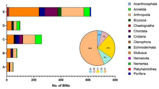 Taxonomic composition of the graded BINs resulting from the BAGS analysis. A and B represent concordant records, C records with multiple BINs for the same species, D records with insufficient data, and E discordant records (more than one species in the same BIN). Chordata only includes Ascidiacea.
