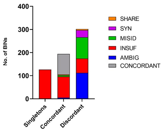 Results from the BIN discordance report performed on the BOLD database. This analysis separates the BINs into three categories: singletons (BINs with only one record), concordant (BINs with no taxonomic discordance), and discordant (BINs with taxonomic discordance). The BINs were then tagged according to the designed workflow into: AMBIG (ambiguous records), INSUF (insufficient records), MISID (misidentifications), SYN (synonyms), or SHARE (if the BIN system was not able to discriminate well-established species).