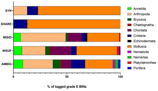 All BINs corresponding to grade C morphospecies were considered RELIABLE as all groups were monophyletic (Figure S1). The BIN discordance report that was created for grade E records on BOLD separates the BINs into three categories: singletons (BINs with a single record), concordant (BINs with no taxonomic discordance), and discordant (BINs with taxonomic discordance). For the 622 graded E BINs, this report indicated that 20% were singletons, 31% were concordant, and 49% were discordant (Figure 4). Singletons in graded E BINs are likely the result of private records (records that researchers have deposited on BOLD but are not publicly available); these were immediately tagged UNCERTAIN since they hold insufficient records. Concordant and discordant records were analyzed case by case following the established workflow (Figure 1). Of the 194 concordant BINs, 99 (51%) were considered UNCERTAIN (91 INSUF). Three BINs (BOLD:AAA2185, BOLD:AAA4734, and BOLD:ACQ2249) assigned to species of the Mytilus genus were considered UNCERTAIN as the Mytilus edulis species complex is composed of three closely related species: M. edulis Linné, 1758, M. galloprovincialis Lamarck, 1819 and M. trossulus Gould, 1850 [55]. Of the 302 discordant, 174 were tagged AMBIG, 92 MISID, 31 SYN, and 5 SHARE (Figure 4). Most BINs tagged SYN, SHARE and INSUF belonged to Mollusca (77%, 88%, and 38%, respectively), while Arthropoda and Mollusca dominated the MISID (42% and 30%, respectively) and AMBIG records (28 and 26%, respectively) (Figure 5). After the curation, 216 BINs (35%) were solved and considered RELIABLE. A total of 70% of all AMBIG records were tagged INSUF, which represents 34% of all BINs (378 in the total 1105 BINs) (Figure 4).