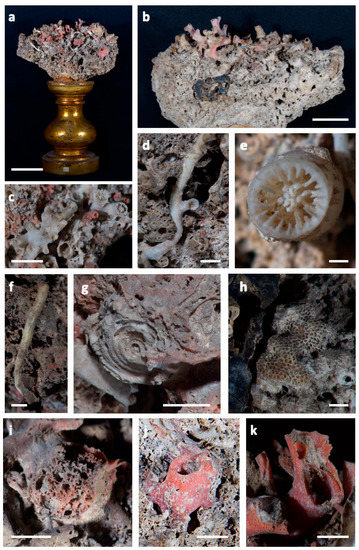 - Casas-Güell, E.; Cebrian, E.; Garrabou, J.; Ledoux, J.B.; Linares, C.; Teixidó, N. Structure and biodiversity of coralligenous assemblages dominated by the precious red coral Corallium rubrum over broad spatial scales. Sci. Rep. 2016, 6, 36535. [Google Scholar] [CrossRef]