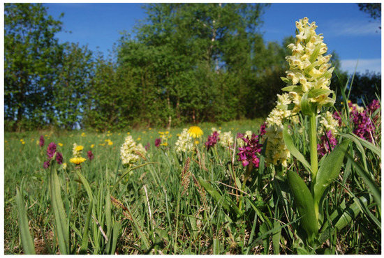 - Kropf, M.; Kriechbaum, M. Variation des Blühverhaltens und der Blütenfarben-Häufigkeiten als Voraussetzung für negativ dichte-abhängige Selektion durch Bestäuber bei der dimorphen Dactylorhiza sambucina. Sauteria 2009, 18, 209–222. [Google Scholar]