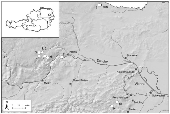 All data presented are from federal state Lower Austria in the northeast of Austria. Within Lower Austria, we observed ten D. sambucina populations from four different regions (Figure 2): mainly from the Waldviertel region (six populations) representing the Bohemian Massif (cf. [23,44,45]), but also one adjacent population from the Wachau region close to the Danube river, a single subpopulation from the Weinviertel region near Retz (i.e., Mittelberg), and two from the Wienerwald region southwest of Vienna. The single populations from the Wachau and Weinviertel regions represent part of the Pannonian area, where the study species is quite rare (see [22,46,47]). In the mountainous regions of the Bohemian Massif and the Alps (here: Wienerwald region), D. sambucina is generally more frequent, but not common, as is also documented by its national Red List status “vulnerable” [48]. All sites represent nutrient-poor, extensively managed grasslands (i.e., meadows and pastures); however, the two Pannonian populations occur in drier and warmer conditions than those from the mountainous regions.
