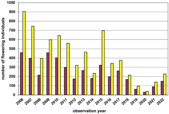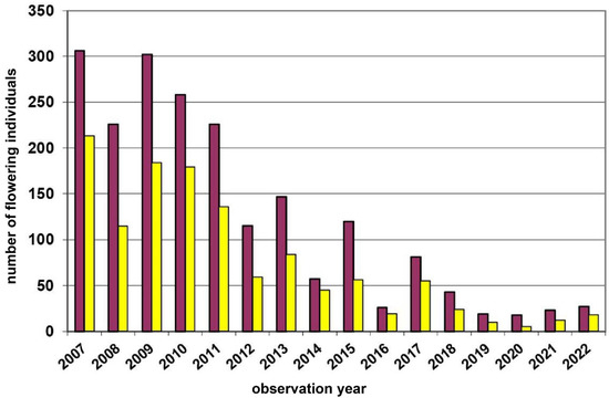As the documentation of non-flowering, vegetative plant individuals remains more difficult and error-prone in the field, such data sets are much more limited. Here, we present one 16 year data set for a monochromic subpopulation from a hill, Mittelberg (325 m a.s.l.), near Retz (Weinviertel; Figure 6). While this population was rather constant in number of individuals with only 3.4 times difference between the highest (2011) and the lowest (2020, 2022) counts, the percentage of flowering individuals varied much more: at first, the proportion of flowering individuals was higher than the vegetative ones in only four years (i.e., 25%; Figure 6). Second, the observed minimum proportion of flowering plants was around 4%, while the maximum proportion was 74.4%. Moreover, the latter both extremes were observed in two subsequent years (2010 and 2011). Such tremendous differences between consecutive years might be explained by resource limitation, allowing mass flowering under good environmental conditions in one year, but forcing individual plants to recreate subsequently; thereby, skipping cost-intensive flowering and fruiting for one or more years (cf. [19,58]). However, this large variation in flowering ratios of D. sambucina populations, provides further difficulties, when estimating flower colour frequencies, because vegetative individuals cannot reliably be assigned to one or the other flower colour. Furthermore, it remains unknown, if both flower colour morphs behave equal in terms of propensity to flower.