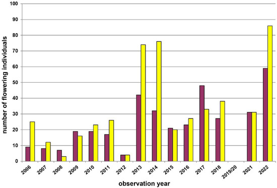 Population census (2006–2022) of the Dactylorhiza sambucina-population Hocheck near Grub (transect) in the Wienerwald region. This population was not visited by us in the years 2019/2020. Red columns = red-flowering plants and yellow columns = yellow-flowering plants.
