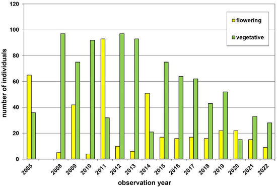 Within the Weinviertel region, at Mittelberg near Retz, we investigated one subpopulation (patch M-VIIIa), where we counted both flowering and non-flowering individuals (Figure 6). Typically, non-flowering plants dominated (64.1–95.8%), which might indicate juvenile plants still too young to flower and/or adult plants not flowering in given years. However, in four years (i.e., 2005, 2011, 2014, and 2020) the number of flowering plants was considerably higher (59.5–74.4%), while the total census was rather constant (i.e., 37-125 individuals) over 15 consecutive study years (2008–2022).
