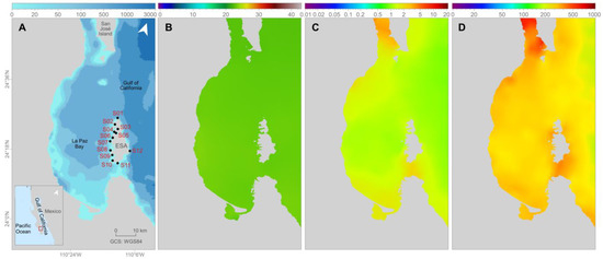 Espíritu Santo Archipelago is situated in the southwestern Gulf of California, Mexico (Figure 1A). This archipelago conforms mainly to the emerged lands of Espíritu Santo (83.79 km2), La Partida (0.94 km2) and Los Islotes (0.03 km2) [34]. The shoreline is characterized by rocky (75%) and sandy (11%) substrates, with a minor contribution of coral deposits and macroalgae [35,36]. The area has a semi-desert climate due to low cloud coverage and mean evaporation (300 mm) that is greater than the mean precipitation (180 mm). In addition, negligible freshwater is provided by rivers or arroyos, as they are dry most of the year, creating hyperhaline conditions [37].