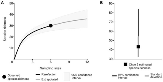 The completeness of the species richness sampling effort was explored through the construction of a rarefaction curve based on the frequency incidence of species presence-absence data per sampling station with the iNEXT library [58] in the R programming environment, version 4.0.4 [59]. This rarefaction curve constitutes a statistical approach to resampling and was estimated from the complete data set [60]. The asymptote or undetected species richness of this biological inventory [61,62] was estimated based on the Chao 2 nonparametric estimator using the SpadeR library [63] and its respective confidence interval (95%) [64,65,66].