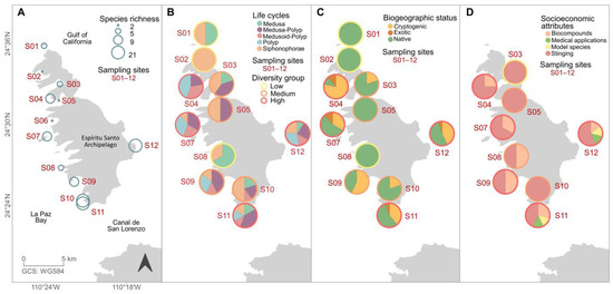 Hydrozoan taxonomy was done following specialized literature for the life stages of medusa (e.g., [43,44,45,46]), polyp (e.g., [46,47,48,49]) and siphonophore (e.g., [50,51,52]). Subsequently, the systematic list of species was complemented with the species’ taxonomic status according to WoRMS [6] and specialized literature for Ventromma halecioides [49]. Systematic classification at the family level was conducted following Maronna et al. [9]. For each species, the observed phase and life stage, as well as the type of substrate for the benthic phase, were recorded. Additionally, to identify the species’ biogeographic status, a search was conducted on taxa with species-level identifications in the online Global Invasive Species Database for internationally distributed species [53] and in CONABIO for species distributed in Mexico [54]. New records of species were assembled at the spatial level of ESA, the Gulf of California, and the Mexican Pacific following Estrada-González et al. [55], and species attributes were assessed in the cultural, medical and tourism sectors according to Santhanam [15] and Marambio et al. [56]. These ecological and socioeconomic characteristics were grouped by the sampling station and geo-represented using Quantum GIS (QGIS) version 3.16.16 [57].