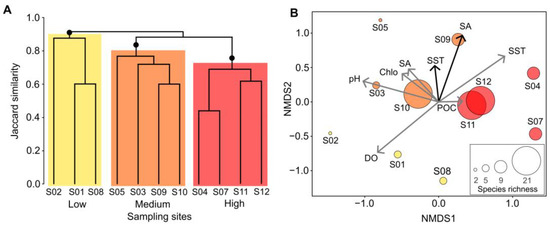 Figure 4. Structure of the hydrozoan taxocene in the Espíritu Santo Archipelago. (A) Hierarchical clustering analysis. Significant differences (p < 0.001) are denoted at the nodes; (B) Non-metric multidimensional scaling analysis showing in situ (black arrows) and satellite (gray arrows) environmental factors. Circle size reflects the species richness at each sampling site (S01–S12). Chlo: chlorophyll-a, DO: dissolved oxygen, POC: particulate organic carbon, SA: salinity, SST: sea surface temperature. The diversity groups correspond to the colors of the cluster.