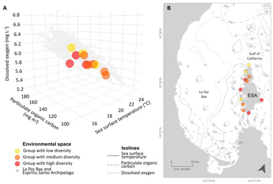 Figure 5. Environmental factors of particulate organic carbon, dissolved oxygen and sea surface temperature in the La Paz Bay and Espíritu Santo Archipelago. (A) Three-dimensional environmental space; (B) Isoline map.