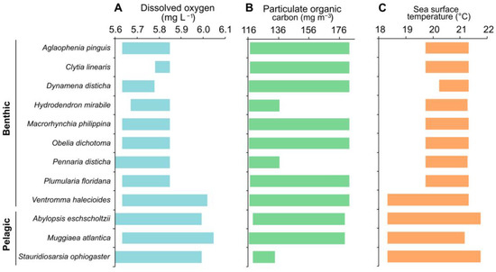 Hydrozoan species in the pelagic phase, A. eschscholtzii, M. atlantica and S. ophiogaster, showed a wider range of environmental preferences of satelital DO (5.56–6.08 mg L−1), POC (116.20–182.40 mg m−3) and SST (18.31–21.92 °C) than their benthic counterparts with narrow values of DO (5.63–6.02 mg L−1), POC (116.20–182.40 mg m−3) and SST (18.31–21.32 °C) (Figure 6), which was reflected in the extent of their distribution in the sampling sites. In the benthic phase. V. halecioides was the only species with a wide ecological valence of DO (5.63–6.02 mg L−1), POC (117.00–182.40 mg m−3) and SST (18.31–21.32 °C), which also showed a wide distribution in the ESA.