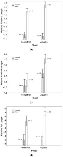 - Malmgren, J.C.; Thollesson, M. Sexual size and shape dimorphism in two species of newts, Triturus cristatus and T. vulgaris (Caudata: Salamandridae). J. Zool. 1999, 249, 127–136. [Google Scholar] [CrossRef]