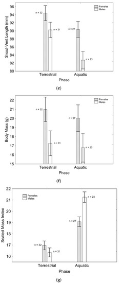 Effects of phase and sex on relative speed (a), relative forelimb length (b), relative hindlimb length (c), relative tail length (d), SVL (e), body mass (f), and SMI (g). Sample sizes are indicated. Vertical whiskers represent standard errors.