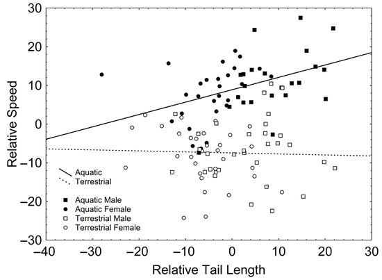 Correlations between relative tail length and relative speed in the aquatic (solid line) and the terrestrial phases (dashed line). Squares represent males whereas circles represent females. Solid symbols represent newts in the aquatic phase whereas empty symbols represent newts in the terrestrial phase.