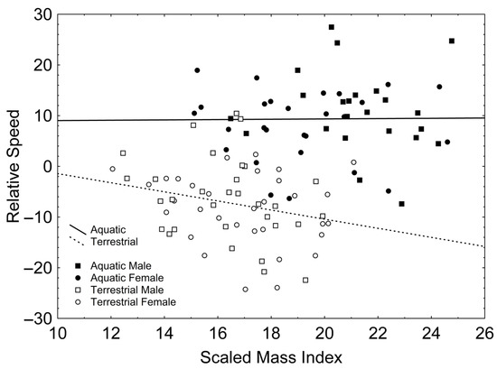 Correlations between the scaled mass index and relative speed in the aquatic (solid line) and the terrestrial phases (dashed line). Squares represent males whereas circles represent females. Solid symbols represent newts in the aquatic phase whereas empty symbols represent newts in the terrestrial phase.