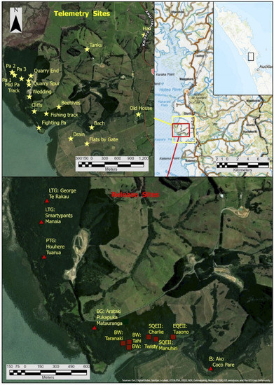 Location of Mataia Restoration Project in relation to the Kaipara Harbour, North Island, New Zealand (inset map), sites where birds were released in 2013 (red squares) and 2014 (red triangles) (B Bach, BG Big Gully, BW Boardwalk, EQEII Eastern QEII Block, LTG Lemon Tree Gully, PTG Peach Tree Gully, SQEII Southern QEII block with individual birds at each site (lower bottom) and 16 telemetry sites used in 2014 (upper left, stars)(‘Hall’ site was not used).