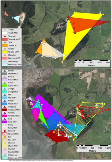 The literature [13,14] suggests that day-time roost or day/night-time ranges may be influenced by habitat area and bird density. Restricted range may potentially have been an issue in this study in relation to the proximity of the Kaipara Harbour water boundary (Figure 2 and Figure 3), however, Jamieson et al [5] reported that free-roaming birds used swamp areas to a limited extent. It is suggested that the property perimeter fence had little if any impact on roost range, as there was substantial distance between the edge of the ranges and the property boundary. In relation to bird densities, the roost range areas in this study are greater than that found on the confined high density Ponui Island [13], but less than the low density, day/night range of the Hawke’s Bay study [14]. This intermediate day-time roost area was expected, due to the lower density of birds at the Mataia property and the large ranges of the birds in the Hawke’s Bay study, due to the measurement of both day and night ranges.