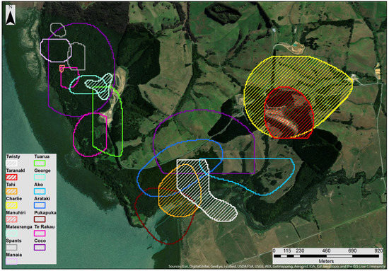 There was substantial overlap in areas of the roost site distribution, determined by MCP or KDE50, particularly within release year cohorts (Figure 2 and Figure 3). Considerable overlap of home range and sharing of burrows by kiwi has been reported for related birds at the densely populated Ponui Island [14]. As the population density at the Mataia site was low, less overlap in roost ranges within years was expected. However, an overlap of roost ranges has been demonstrated by Jamieson et al. [5] and may reflect the proximity of suitable habitat at the Matai site. The overlapping roost areas for Taranaki (female) and Charlie (male) was expected as these birds had pair bonded.