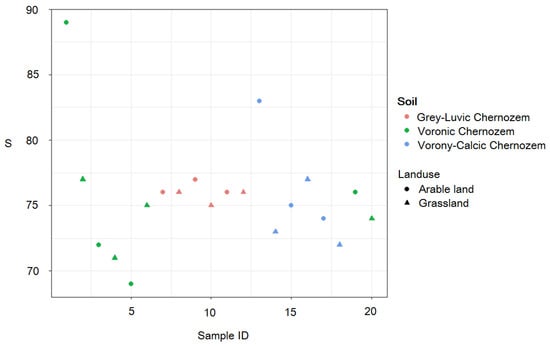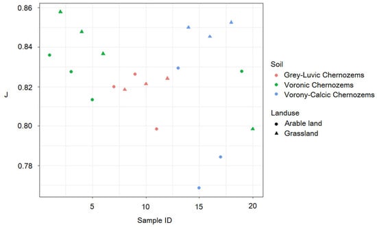The largest values characterize the non-arable Gray-Luvic and Vorony-Calcic Chernozems, the smallest arable Gray-Luvic Chernozems. The Pielou evenness index for most samples also remains at a similar level (Figure 3), although for some of them its values may deviate significantly, mainly highlighting more even communities.
