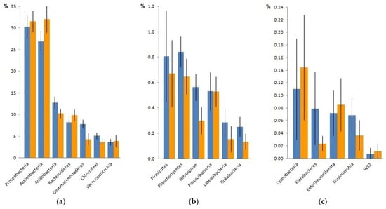 Taxonomical structure of chernozem bacterial communities on the level of phyla, (a–c) include different phyla and differ in scale. Blue bars represent arable soils, orange represent non-arable. Confidence intervals at 95% showed as error bars were calculated for n = 10.