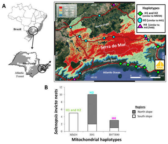 In this study, we characterized the molecular diversity of S. invicta populations bordering the Atlantic Forest near the seacoast of São Paulo State in Brazil. The study area was selected to contain a significant geographical formation including two well-defined faces of a forested mountain range, which—in principle—cannot be colonized by fire ants. In short, the obtained results indicate a pattern in which imported mitochondrial haplotypes H1 and H2 (supergroup A) colonized the south slope facing the seaside, not far from a maritime port at the city of São Sebastião (São Paulo State, Brazil), while native haplotypes H3 and H4 (supergroup B) were restricted to the north slope facing the continental plateau, likely coming from western Brazil. The fact that H1 and H2 remain limited to the south slope is both indicative of a recent introduction and of the effect of the Serra do Mar range as a geographical barrier delaying the invasive population from expanding into the continent. We further elaborate on this hypothetical scenario below.