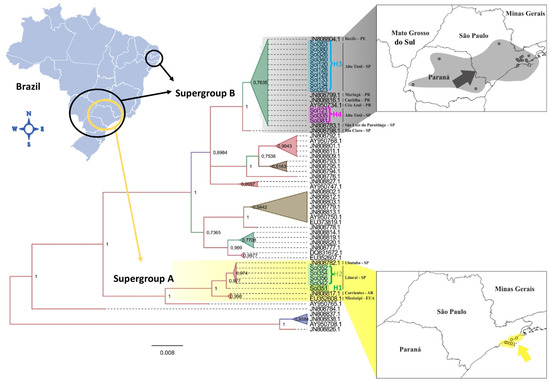 Phylogenetic tree generated by Bayesian inference showing different major lineages of Solenopsis invicta found in the south slope (supergroup A) and north slope (supergroup B) of Serra do Mar in the state of São Paulo, Brazil. Supergroup A is shown highlighted in yellow and includes haplotypes H1 and H2. Supergroup B, in gray, includes haplotypes H3 and H4.