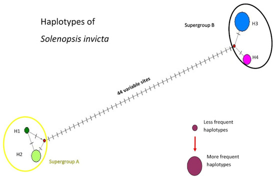 Figure 3 presents the haplotype network analysis that compared the different S. invicta populations obtained in the study area. The observed genetic distances revealed two supergroups, A and B. Supergroup A included haplotypes H1 and H2 and supergroup B included haplotypes H3 and H4; the genetic difference of haplotypes within each supergroup showed less than 1%, whilst the genetic distance between supergroups was greater than 6% (Figure 3). AMOVA analysis results supported supergroups A and B are different (p-value = 0.000), pointing to 98.6% of variance; no difference was found within supergroups (Table 2).