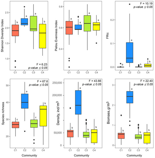 Boxplots of the structural indicators of zooplankton communities in the studied mouth areas. C1, C2, C3, and C4 represent communities 1, 2, 3, and 4. Compact letter displays were added to indicate significant differences. A breakdown of the zooplankton communities and colour coding is shown in Figure 2.