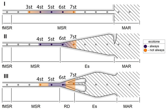 Location of the ecotone (community 2) in different types of mouth areas in the studied tributaries. The mixing zone of water masses of the river and the reservoir is highlighted with a shading line. The scheme is based on that of V.N. Mikhailov et al. [34]. Always—stations in which all (not all) rivers were part of the ecotone (community 2); not always—stations in which not all rivers were part of the ecotone (community 2). (I)—simple mouth area; (II)—estuarine mouth area; (III)—estuary–deltaic mouth areas. The names of the zones are shown in Figure 1.