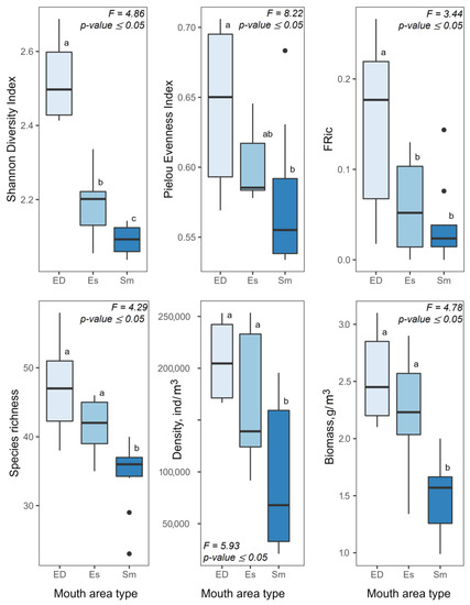 Boxplots of the structural indicators for zooplankton community 2 in the estuary–deltaic mouth areas (ED), estuarine mouth areas (Es), and simple mouth areas (Sm). Compact letter displays were added to indicate significant differences.