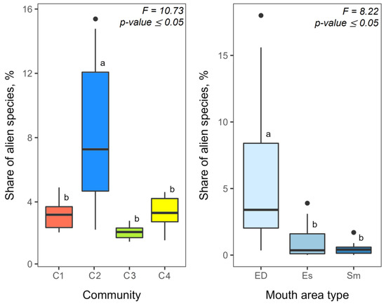 Analysis of the boxplots for the shares of alien species (Figure 6) of zooplankton showed a statistically significant increase (ANOVA, p-value ≤ 0.05) in community 2. The maximum share of alien zooplankton species was recorded in the most morphologically complex estuary–delta mouth areas (ANOVA, p-value ≤ 0.05) (Figure 6).