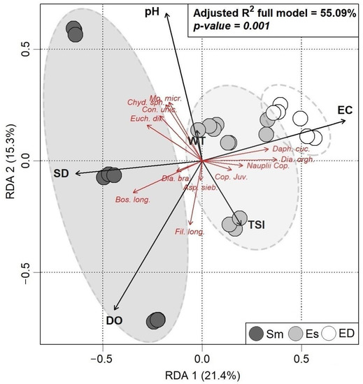Redundancy analysis (RDA) plot for zooplankton community 2. ED—estuary–deltaic mouth areas; Es—estuarine mouth areas; Sm—simple mouth areas. Dominant species: Bos. long.—Bosmina longirostris; Dia. bra.—Diaphanosoma brachyurum; Nauplii Cop.—Nauplii Copepoda; Daph. cuc.—Daphnia cucullata; Dia. orgh.—Diaphanosoma orghidani; Cop. Juv.—Copepodit Juv.; Asp. sieb.—Asplanchna sieboldi; Con. unic.—Conochilus unicornis; Euch. dil.—Euchlanis dilatata; Chyd. sph.—Chydorus sphaericus; Mo. micr.—Moina micrura; Fil. long.—Filinia longiseta.