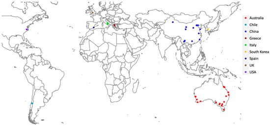 Thirty-two M. persicae samples were collected by direct searching for aphids from a variety of host plants from around Australia between 2019 and 2021, while several historical samples, which were collected from the field and had been placed in culture, were also included (Table 1). Ten individuals from each sample were stored in 100% ethanol and frozen at −20 °C for later molecular analysis. The samples in culture were maintained as asexual lines established from a single female in the laboratory on single bok choy (Brassica napus subsp. chinensis) leaves that were placed in 60 mm petri dishes containing agar (1%). Petri dishes were kept in a controlled temperature cabinet at 11 °C, with a 16L:8D h photoperiod. Twenty-one aphid samples were collected from China (n = 2 to 25) from eight different plant hosts between 2016 and 2021. An additional 15 clones from Europe, the USA, Chile, Zimbabwe, South Korea and Japan (N = 5) were included in this study. These clones were established from aphids collected as part of a global study investigating the evolution of resistance in M. persicae [15], with these aphids being maintained as asexual lineages on individual wombok (Brassica rapa var. pekinensis) leaves in small plastic cups at 20 °C, with a 16L:8D h photoperiod prior to this study.