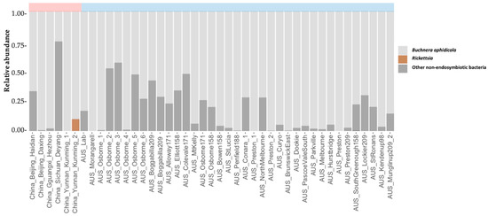 Secondary endosymbionts in M. persicae populations tested via 16S metabarcoding. Mean relative abundances are shown for each sample included within the study (calculated from 2 technical replicates). Known secondary endosymbionts are shown in color, while the primary endosymbiont, Buchnera aphidcola, and non-endosymbiotic bacteria are shown in grey. The color label on the top of the bar chart represents China, and blue represents Australia. Note that sample codes can be found in Table 1. The group of ‘other non-endosymbionts’ includes all the bacterial detected except for Buchnera and 8 secondary endosymbionts recorded in aphids (Serratia, Hamiltonella, Regiella, Rickettsia, Rickettsiella, Spiroplasma, Wolbachia and Arsenophonus).