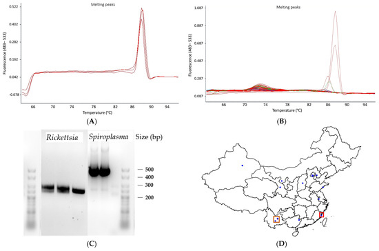 qPCR and PCR amplification of Rickettsia and Spiroplasma. (A). Melting curve of Rickettsia in qPCR showing distinct Tm value of 87 degrees. (B). Melting curve of Spiroplasma in qPCR. (C). Agarose gel images of Rickettsia and Spiroplasma amplicons in traditional PCR. (D) Map showing the 21 sampling points of M. persicae in China (blue dots) with Rickettsia points (brown square) and Spiroplasma points (red square) indicated.