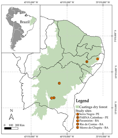 - Sampaio, E.V.S.B. Overview of the Brazilian caatinga. In Seasonally Dry Tropical Forests; Bullock, S.H., Mooney, H.A., Medina, E., Eds.; Cambridge University Press: Cambrigde, UK, 1995; pp. 35–63. ISBN 9780521112840. [Google Scholar]