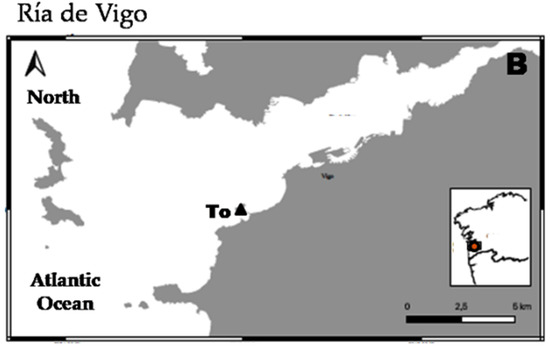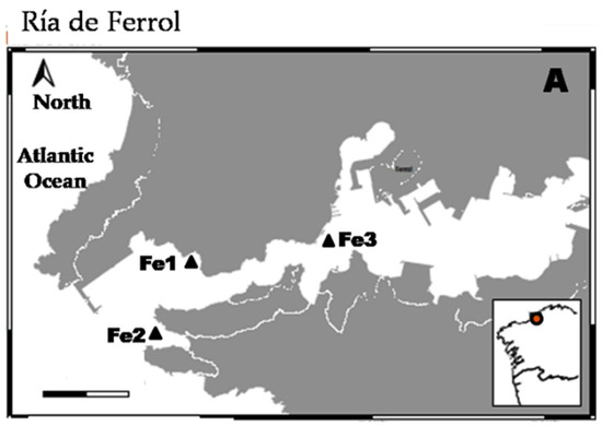 Map showing sampling localities in Ría de Ferrol, scale bar = 2 km (A) and Ría de Vigo, scale bar = 5 km (B).