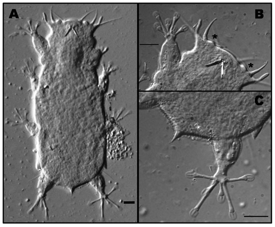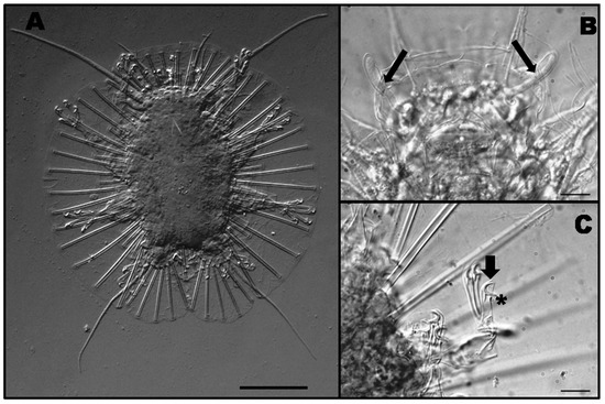Habitus of Act. doryphorus doryphorus. Scale bar = 50 μm (A). Detail of the buccal clavae (black arrows). Scale bar = 10 μm (B). Detail of the claw showing the calcar (asterisk) and the accessory point (black arrow). Scale bar = 10 μm (C).
