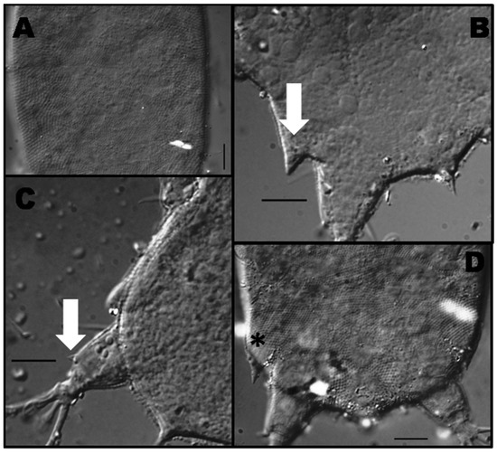 Detail of the dorsal cuticle of Bat. marcelli between legs two and three (A). Dorsal view of the fourth lateral projection (white arrow) (B). Detail of the papilla on the fourth pair of legs (white arrow) (C). Ventral view of the fourth lateral projection (asterisk) (D). Scale bars = 10 μm.