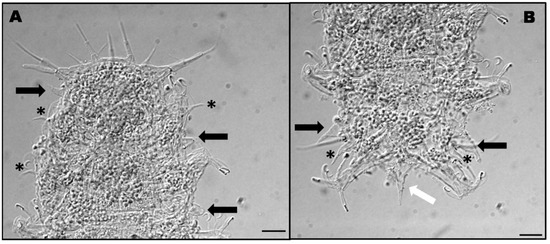 Detail of the anterior part of the body of Hal. remanei remanei. Black arrows show body lateral projections. Asterisks indicate the position of sensory spines on legs I and II (A). Detail of the posterior part of the body of Hal. remanei remanei. Black arrows show the fourth body lateral projections. Asterisks indicate the position of sensory spines on legs IV. The white arrow shows the caudal apparatus (B). Scale bars = 10 μm.