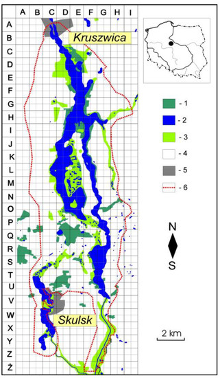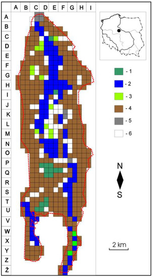 They were digitized on the basis of orthophotomaps (https://geoserwis.gdos.gov.pl/mapy/) using QGIS 2.0 Dufour software (accessed on 15 November 2020). The covered area and proportion of the total area were determined in relation to the whole study area and each grid cell (0.5 km × 0.5 km).