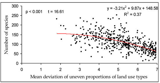 Dependence of plant species richness on mean deviation of uneven proportions of various land use types in grid cells.