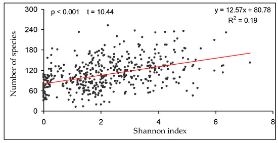 In addition, the Shannon index of diversity (H’) indicates a dependence of species richness on landscape composition. Growing H’ values increase the chance of higher species richness in grid cells (Figure 5), but this relationship is weaker (R2 = 0.19) than for mean deviation of uneven proportions of various land use types (R2 = 0.37).