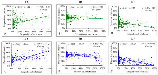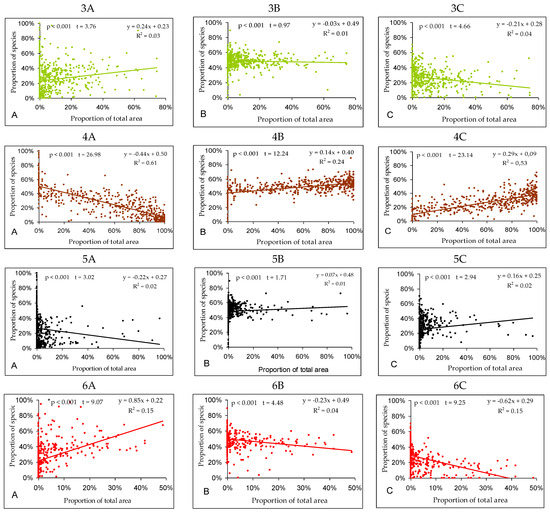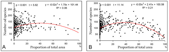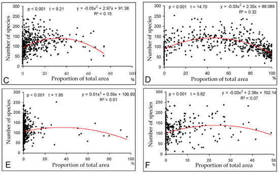 Dependence of plant species richness on proportions of land use types in grid cells: (A)—forests; (B)—surface waters and wetlands; (C)—meadows and pastures; (D)—arable fields; (E)—built-up areas, orchards, and private gardens; (F)—marginal habitats.