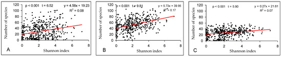 Effect of cultural landscape heterogeneity, expressed by the Shannon index of diversity (H’), on numbers of non/semi-synanthropic native species (A), apophytes (B), and alien species (C) in grid cells.