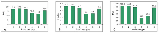Floristic conservation value, based on species composition, expressed by qualitative floristic index Wfj (A), mean coefficient of conservatism C (B), and floristic quality index FQI (C): 1—forests, 2—surface waters and wetlands, 3—meadows and pastures, 4—arable fields, 5—built-up areas, orchards, and private gardens, and 6—marginal habitats.