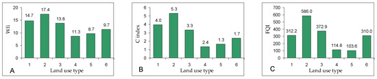 Floristic conservation value based on the structure of floristic data, expressed by quantitative floristic index Wfi (A), mean coefficient of conservatism C (B), and floristic quality index FQI (C): 1—forests, 2—surface waters and wetlands, 3—meadows and pastures, 4—arable fields, 5—built-up areas, orchards, and private gardens, and 6—marginal habitats.