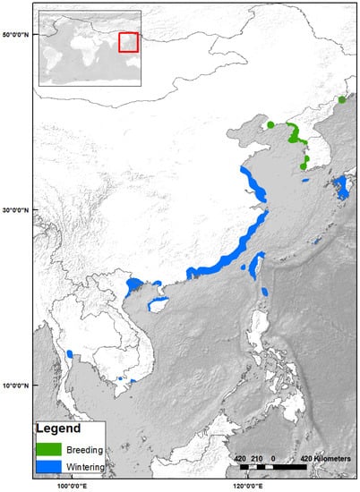 Figure 1. Map showing current breeding areas and regular wintering areas based on BirdLife International [5] and Chen et al. [6].