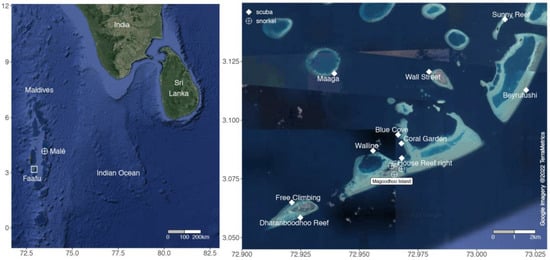 Figure 1. Maldivian Archipelago (left), highlighting the capital Malé (circle) and the Faafu Atoll (square), where most collecting sites are located (right). Scuba diving sites are labeled according to names used by staff at the MaRHE Center, based at Magoodhoo Island.